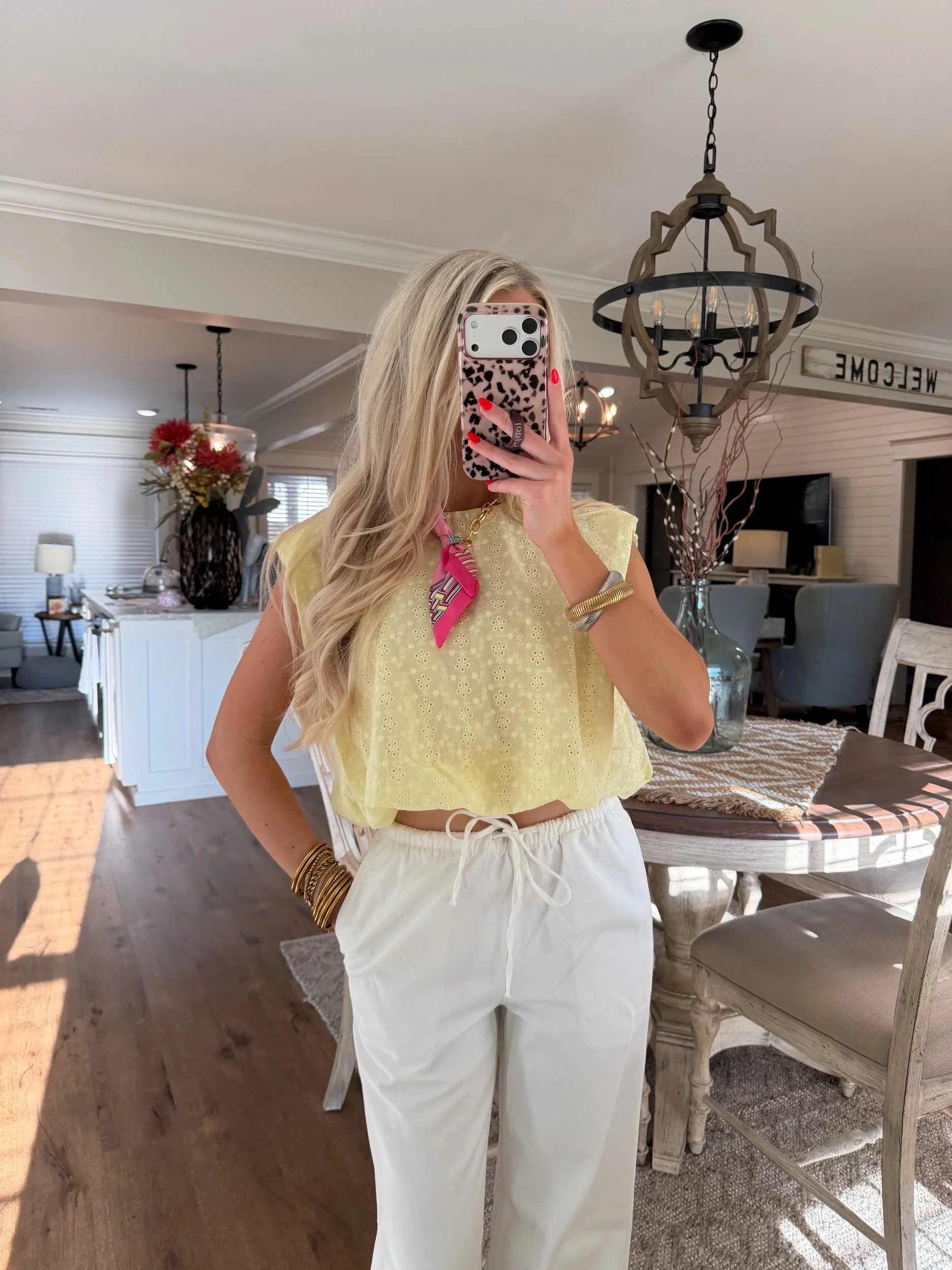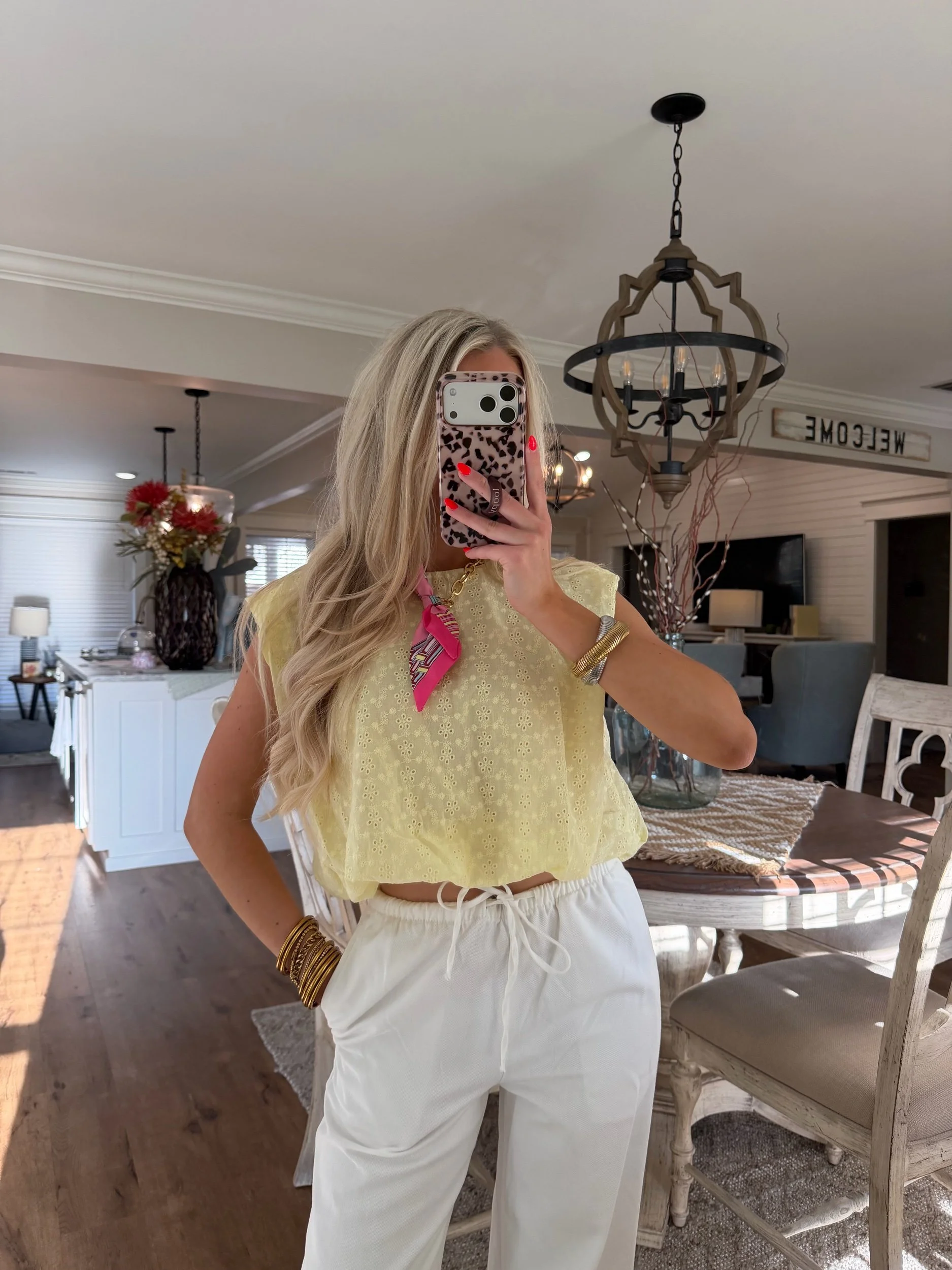 Shop › Eyelet Bubble Top - Pale Yellow Image 1 of 2 Image 2 of 2 Eyelet Bubble Top - Pale Yellow $30.00 • True to size• Slightly cropped• Macie is 5’2 wearing the small Size: Small Medium Large Get notified by email when this product is in stock. Add To Cart Added! • True to size• Slightly cropped• Macie is 5’2 wearing the small