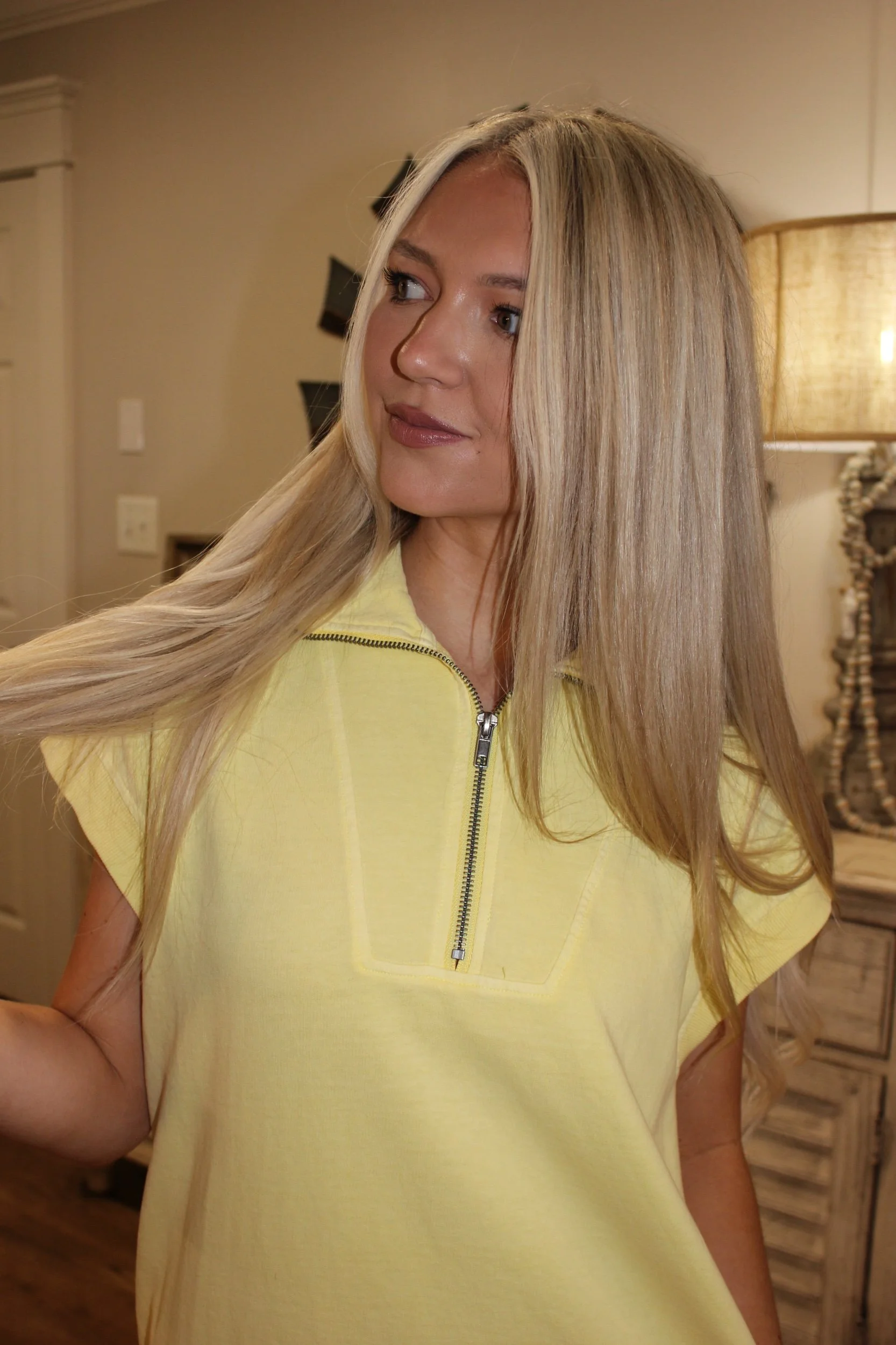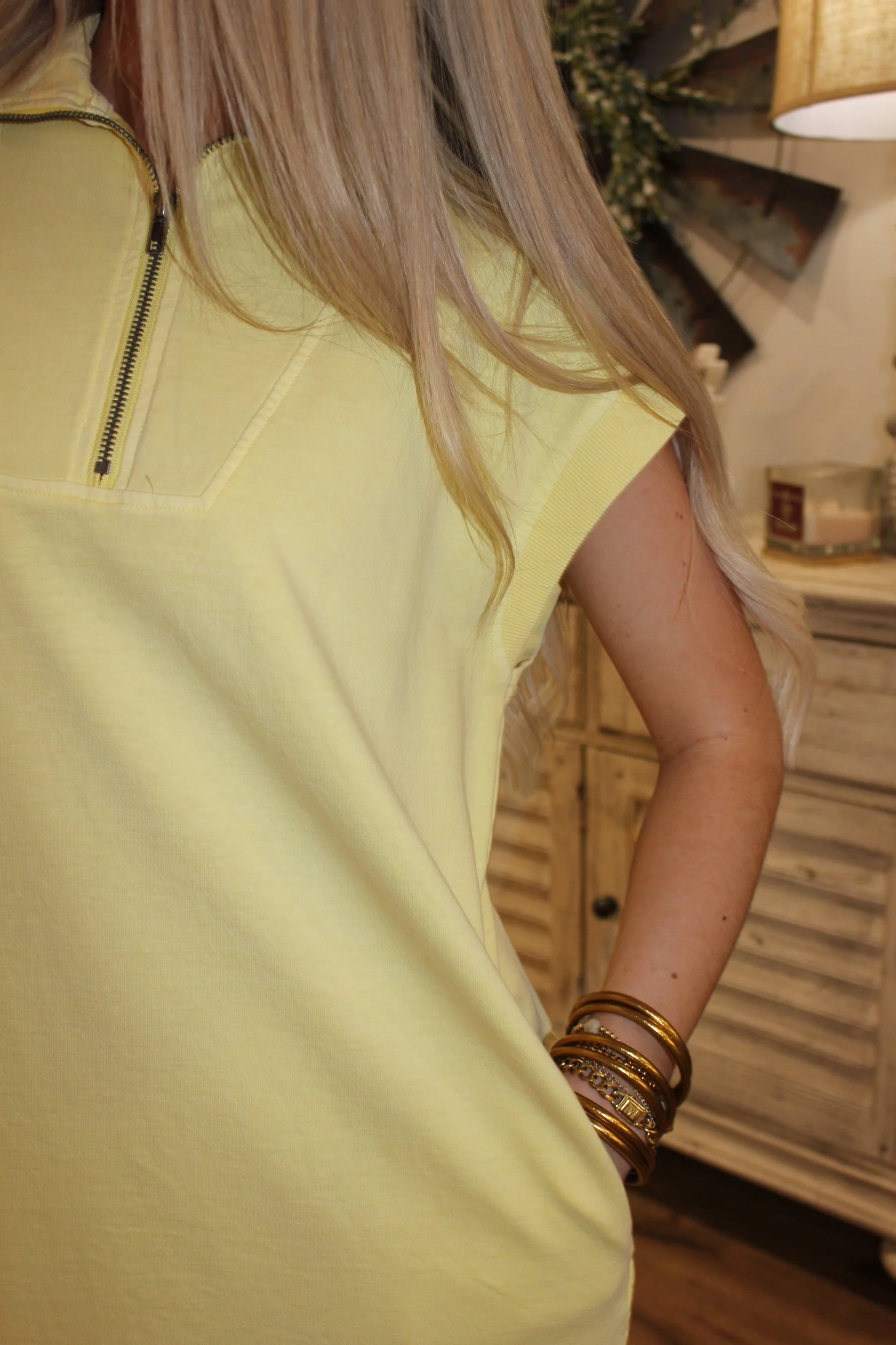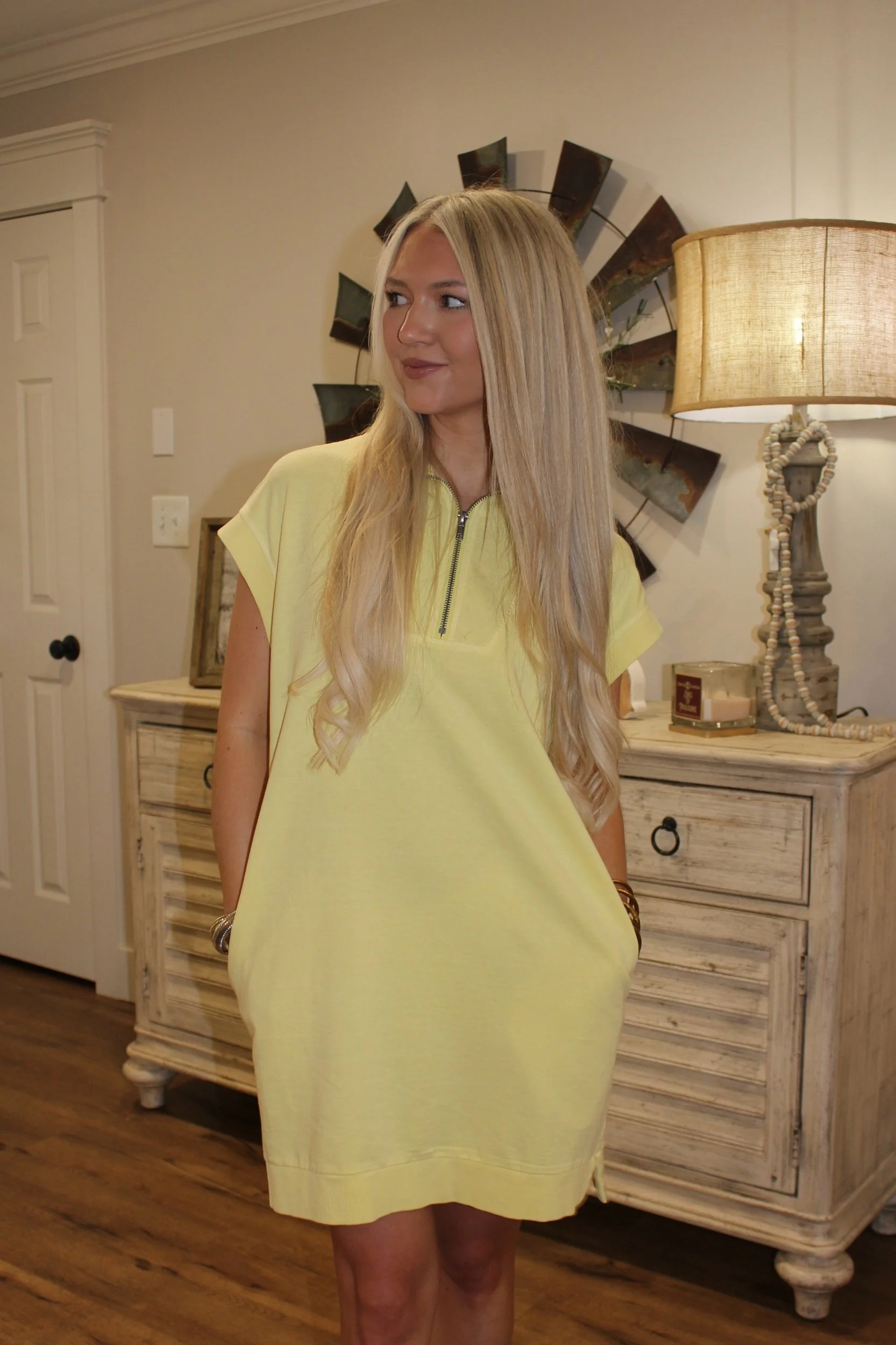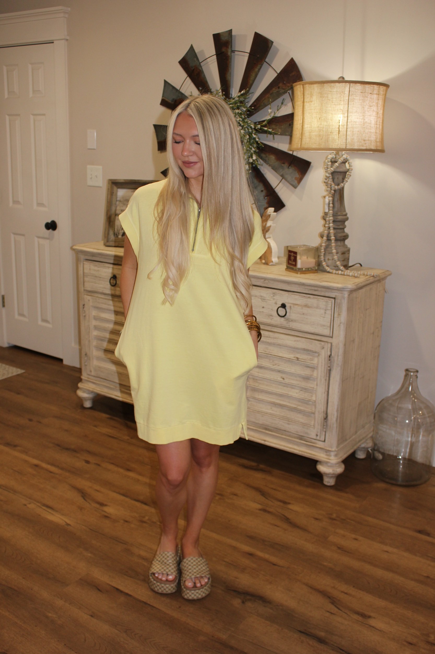 Shop › Mockneck Mini Dress - Pale Yellow Image 1 of 4 Image 2 of 4 Image 3 of 4 Image 4 of 4 Mockneck Mini Dress - Pale Yellow $32.00 • Good length• Working zipper• True to size• Pockets• Macie is 5’2 wearing the small Size: Small Medium Large Add To Cart Added! • Good length• Working zipper• True to size• Pockets• Macie is 5’2 wearing the small