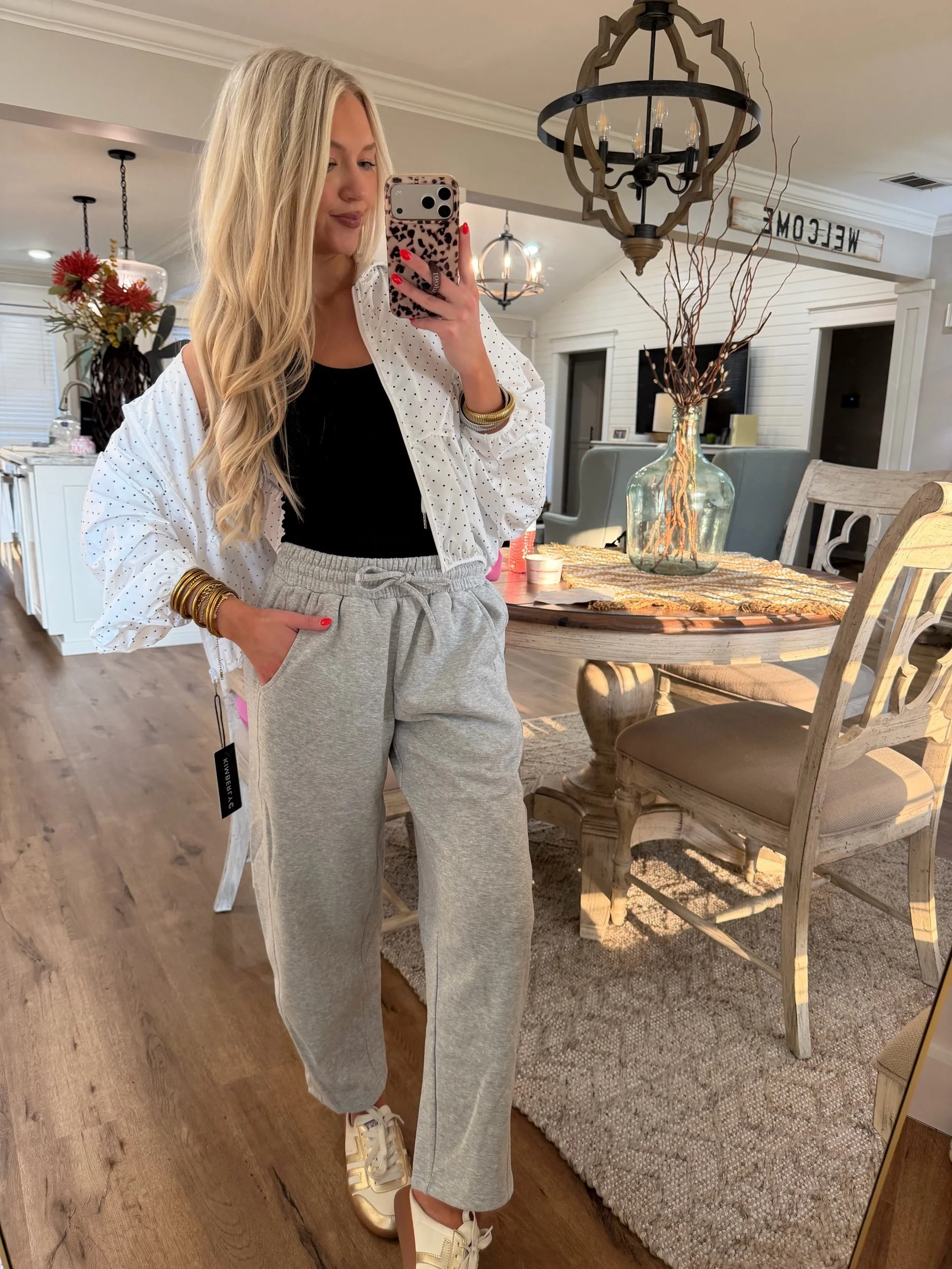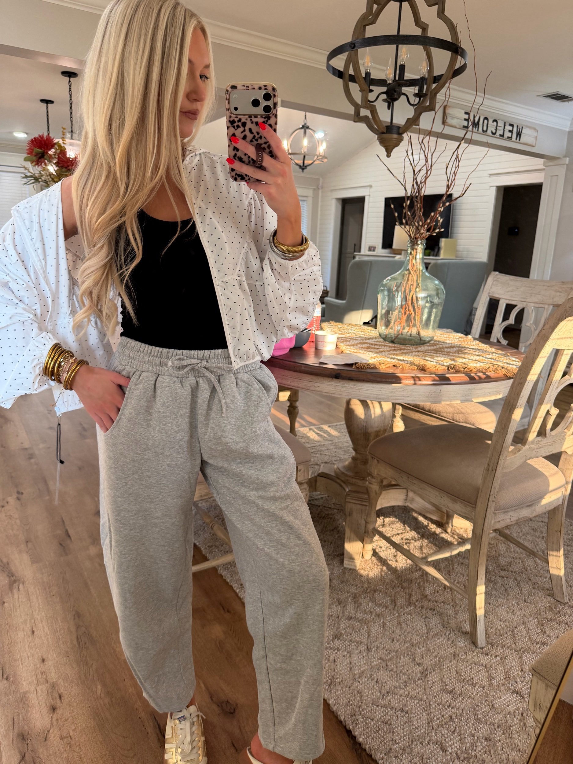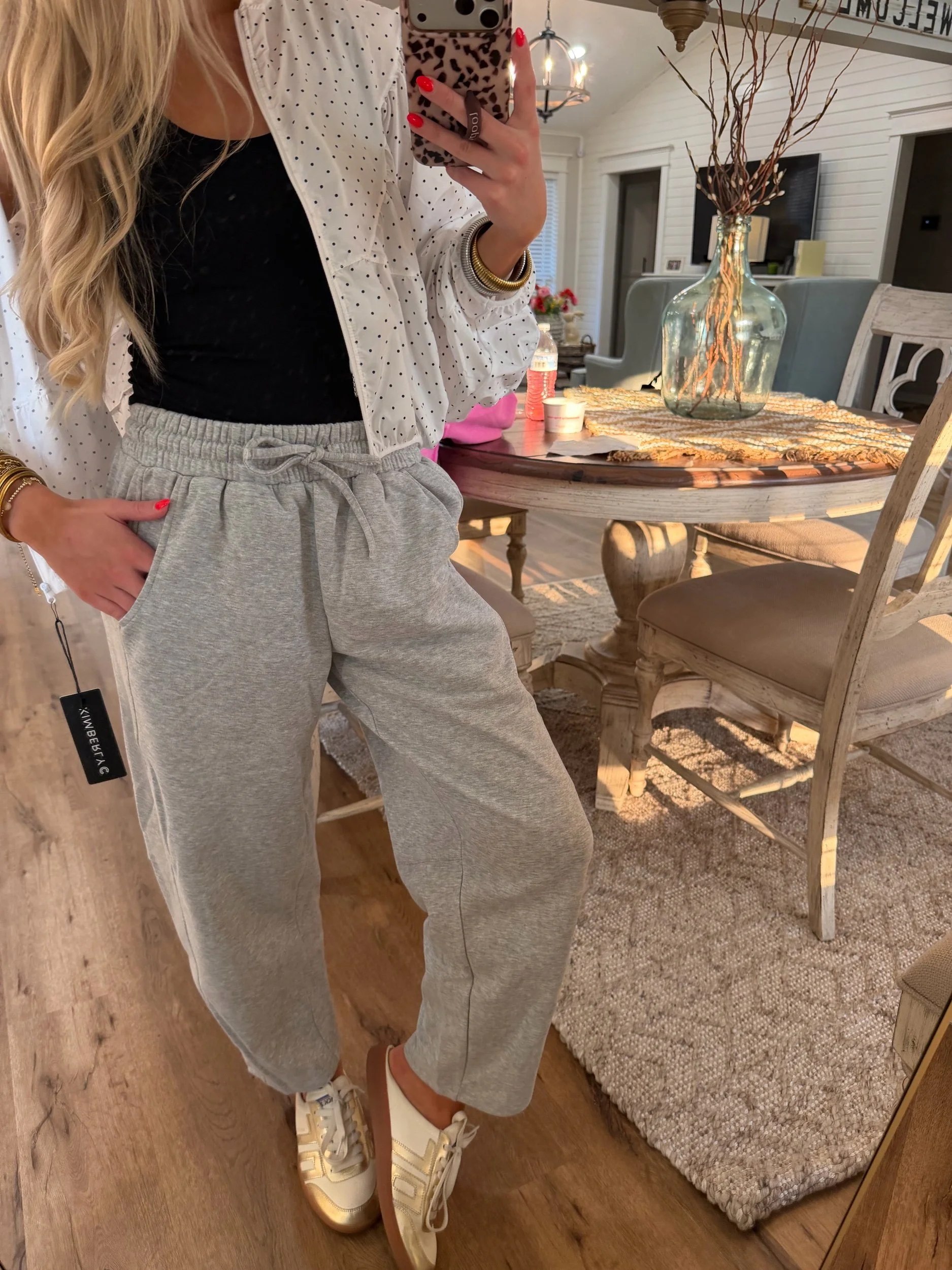 Shop › Barrel Sweatpants - Heather Grey Image 1 of 3 Image 2 of 3 Image 3 of 3 Barrel Sweatpants - Heather Grey $38.00 • Super soft• Tie waist• True to size• Macie is 5’2 wearing the XS Size: XS Small Medium Large Get notified by email when this product is in stock. Add To Cart Added! • Super soft• Tie waist• True to size• Macie is 5’2 wearing the XS
