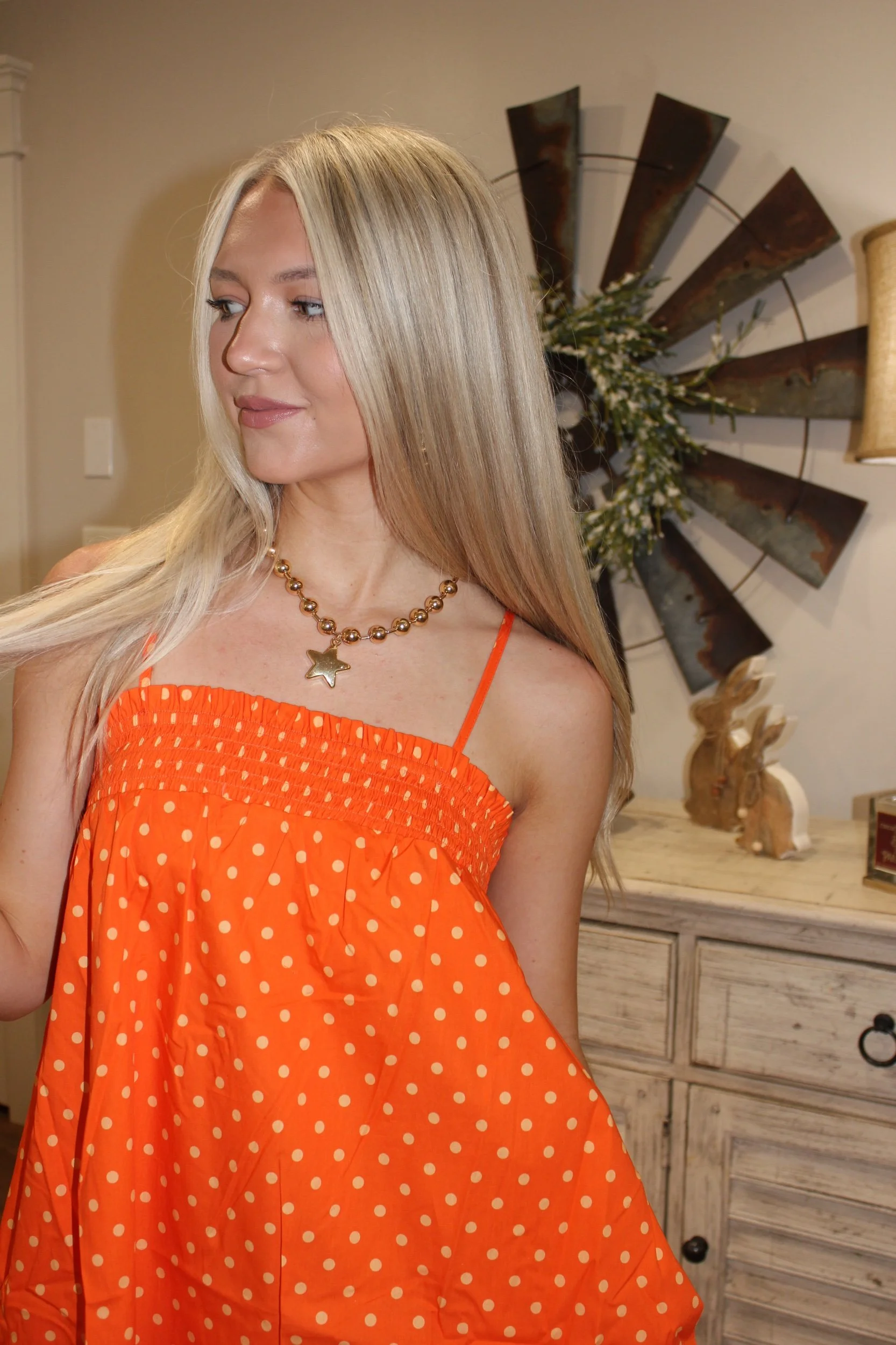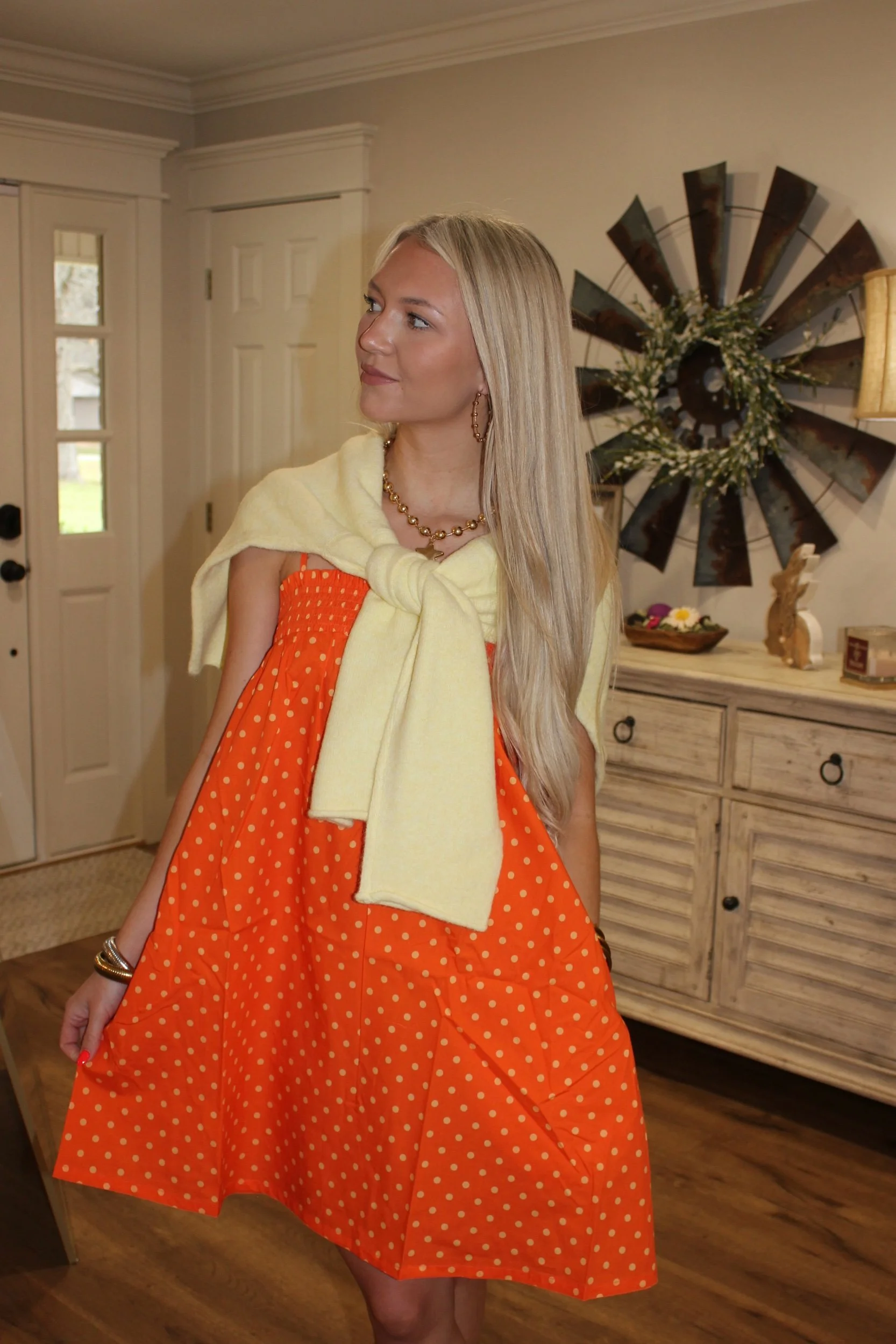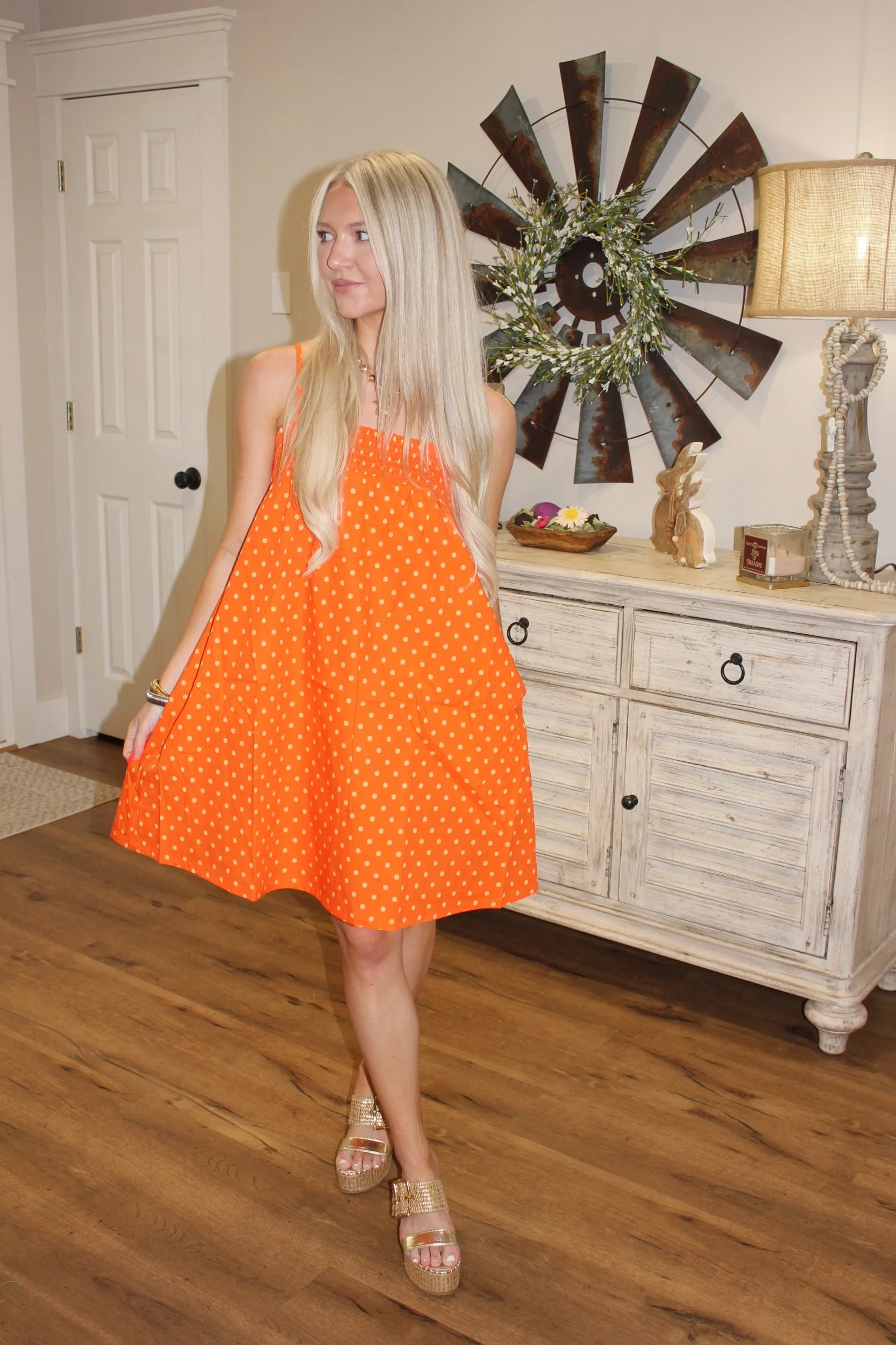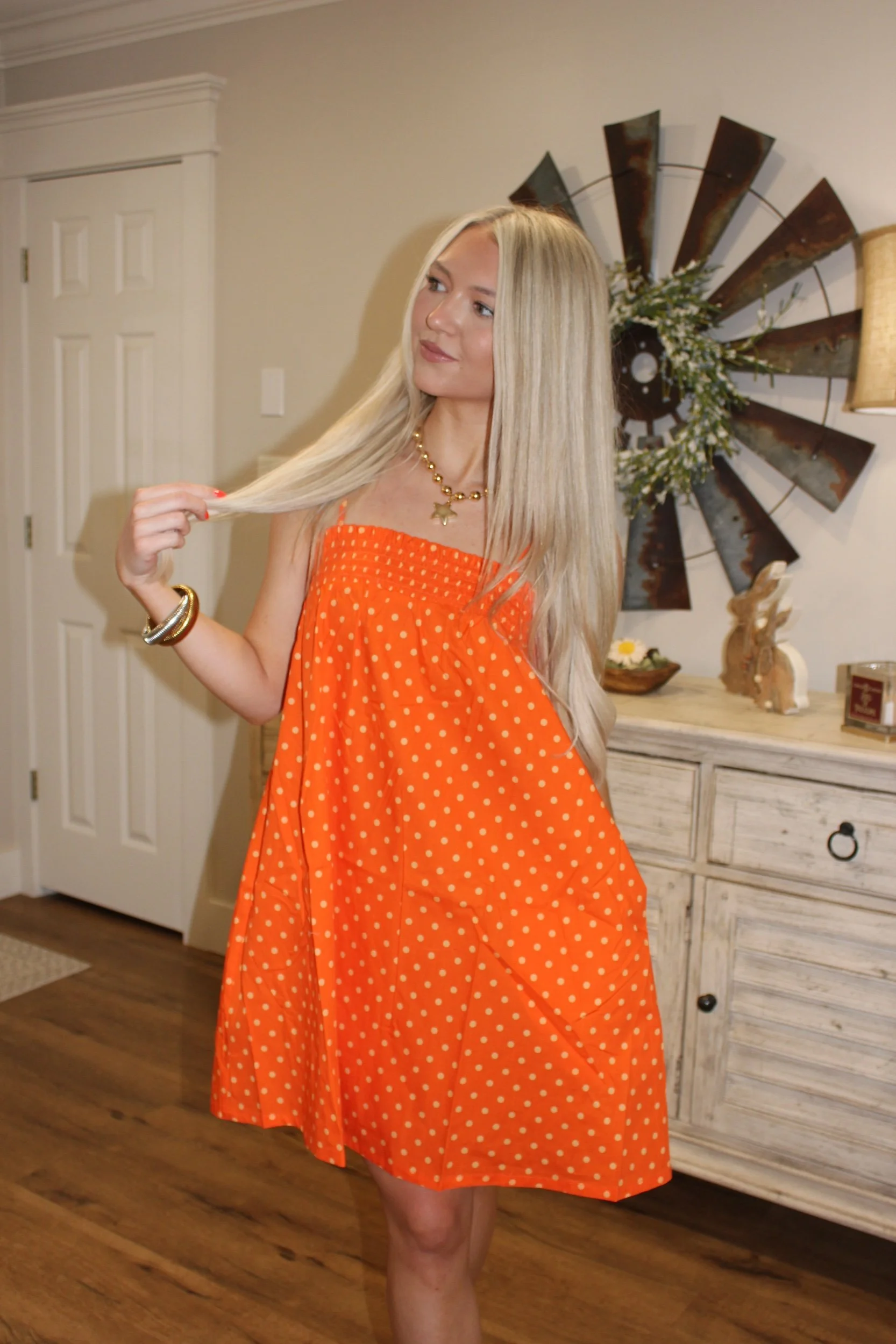 Shop › Mandy Mini Dress - Orange/Yellow Image 1 of 4 Image 2 of 4 Image 3 of 4 Image 4 of 4 Mandy Mini Dress - Orange/Yellow $46.00 • Good length • Adjustable straps• True to size• Macie is 5’2 wearing the small Size: Small Medium Large Add To Cart Added! • Good length • Adjustable straps• True to size• Macie is 5’2 wearing the small