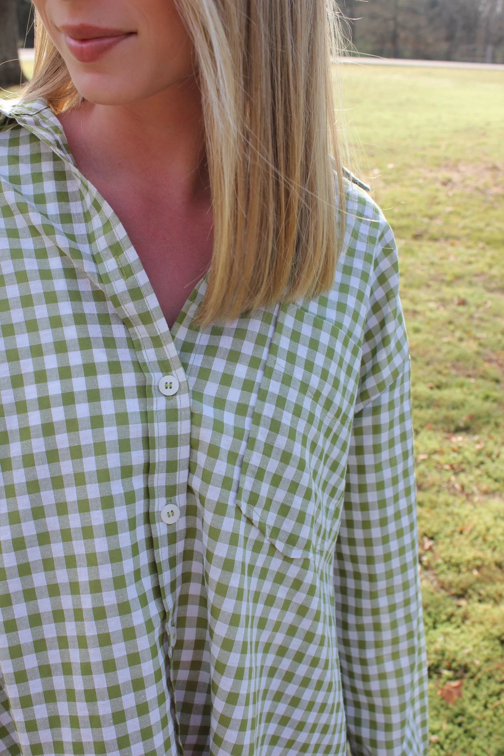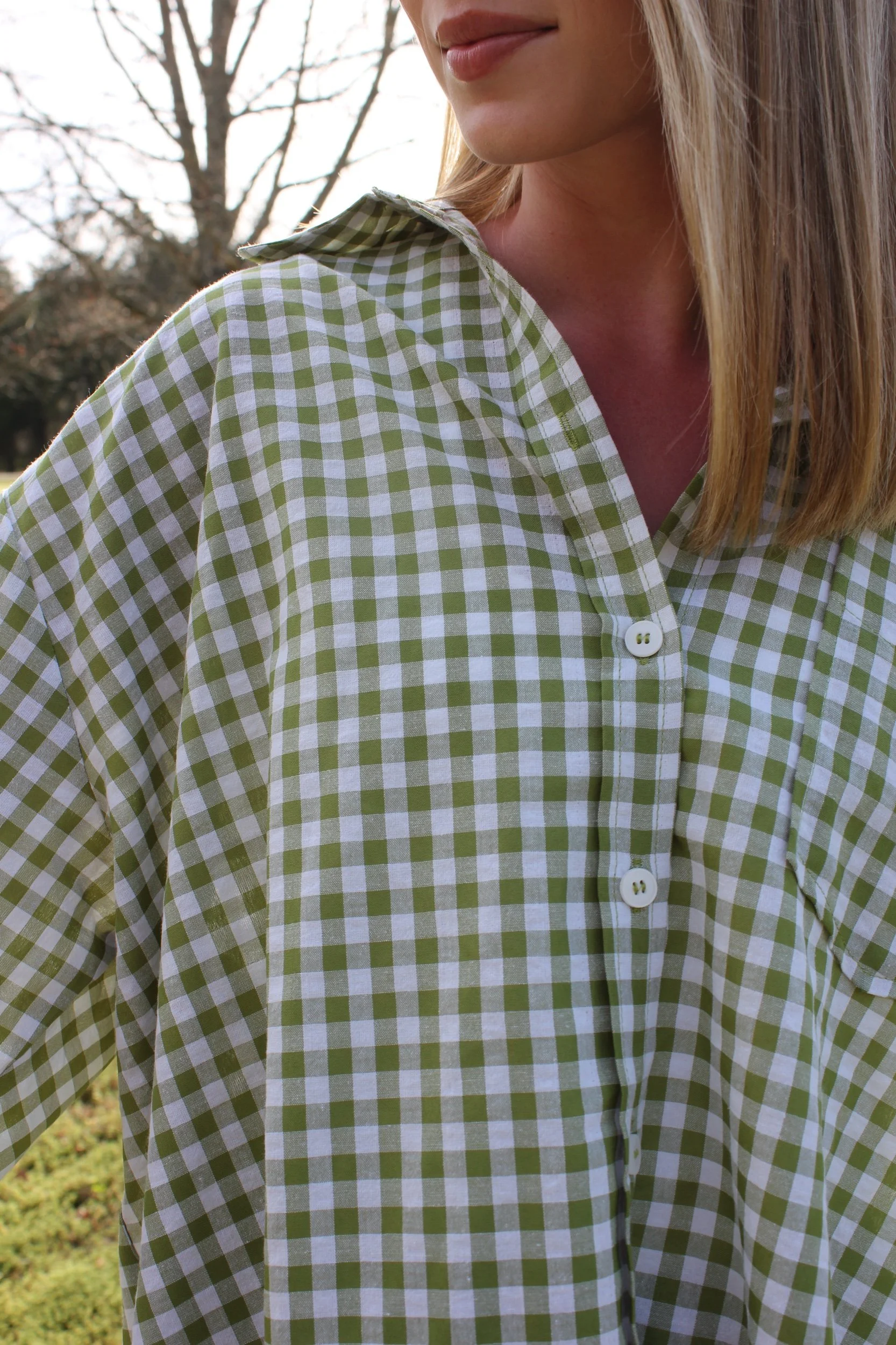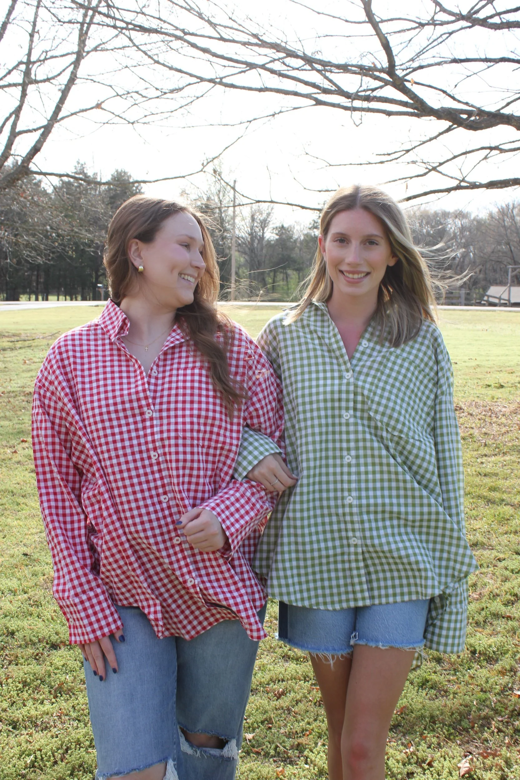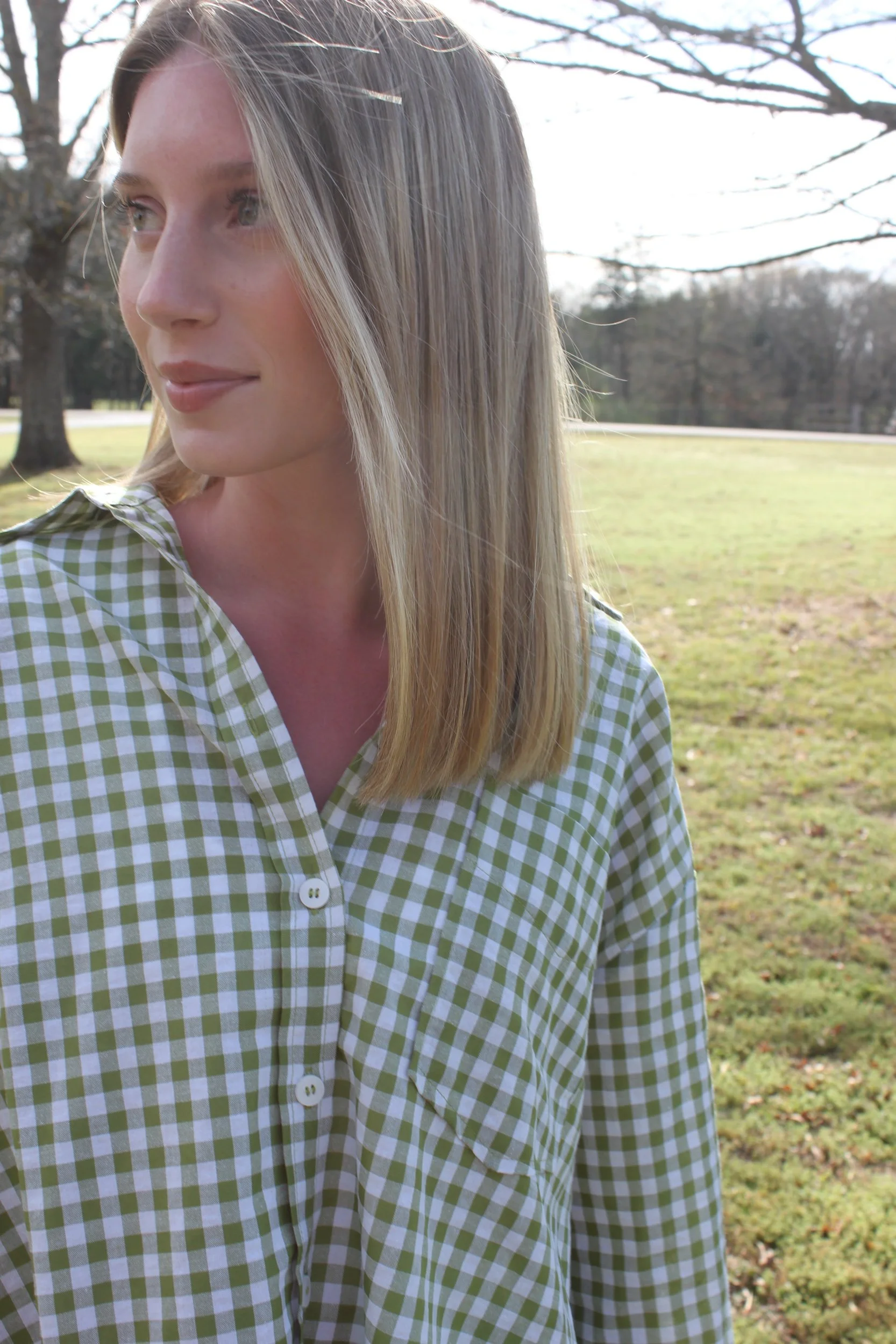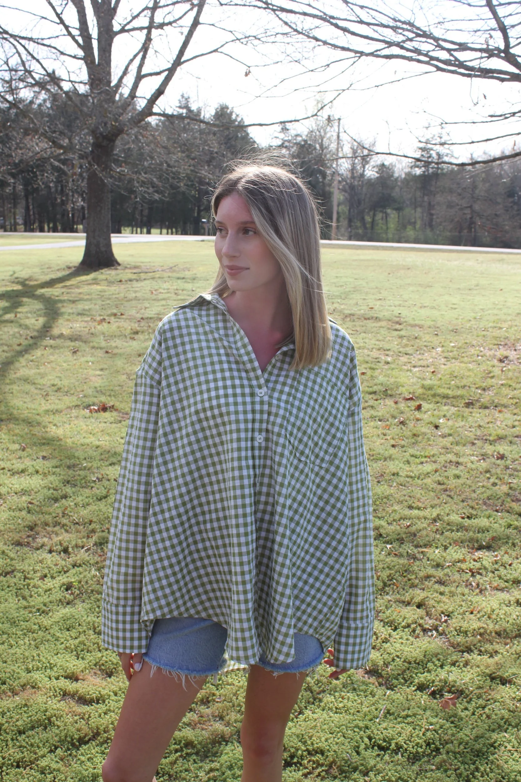 Shop › PREORDER*Gingham Button Down Shirt - Leaf Image 1 of 5 Image 2 of 5 Image 3 of 5 Image 4 of 5 Image 5 of 5 PREORDER*Gingham Button Down Shirt - Leaf $38.00 • Oversized fit• Size down/stick with true size• Hannah is 5’6 wearing the small• Preorder arrives by April 5th Size: Small Medium Large Get notified by email when this product is in stock. Add To Cart Added! • Oversized fit• Size down/stick with true size• Hannah is 5’6 wearing the small• Preorder arrives by April 5th
