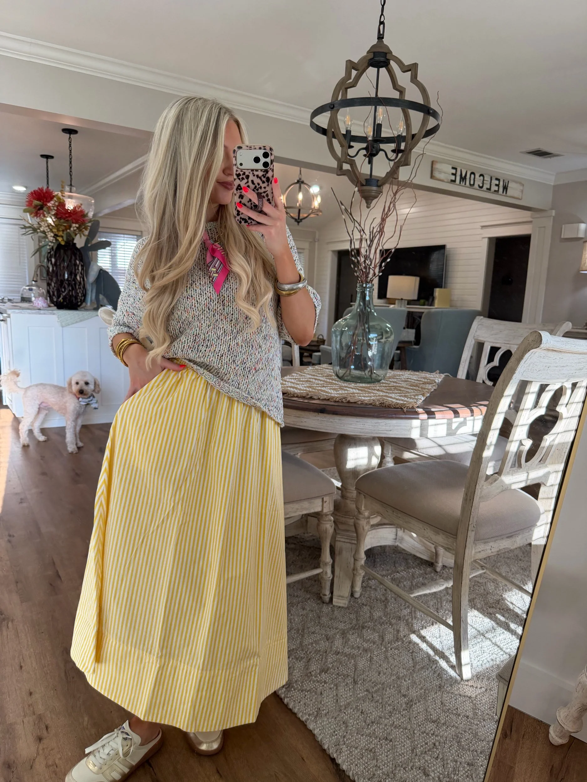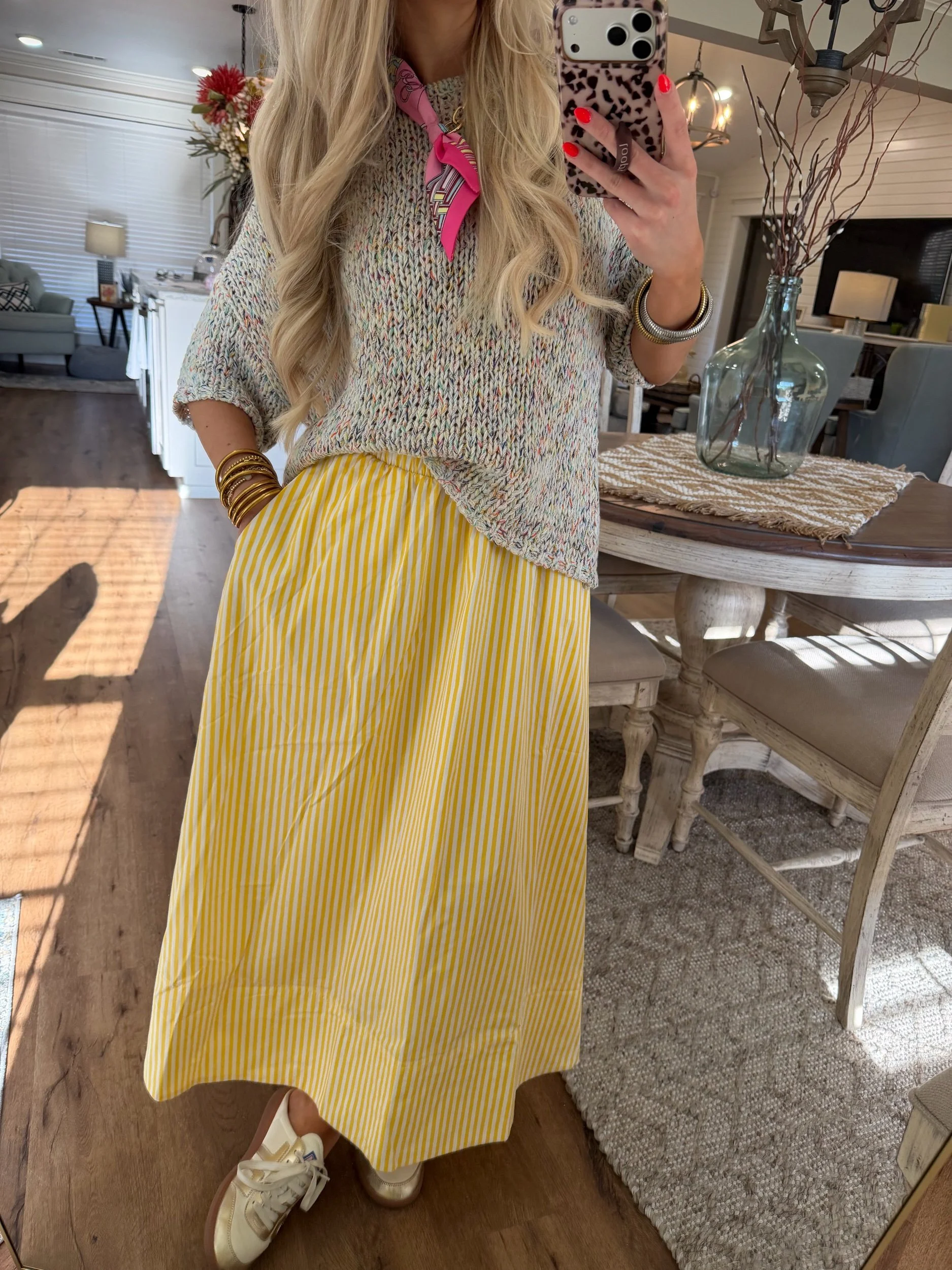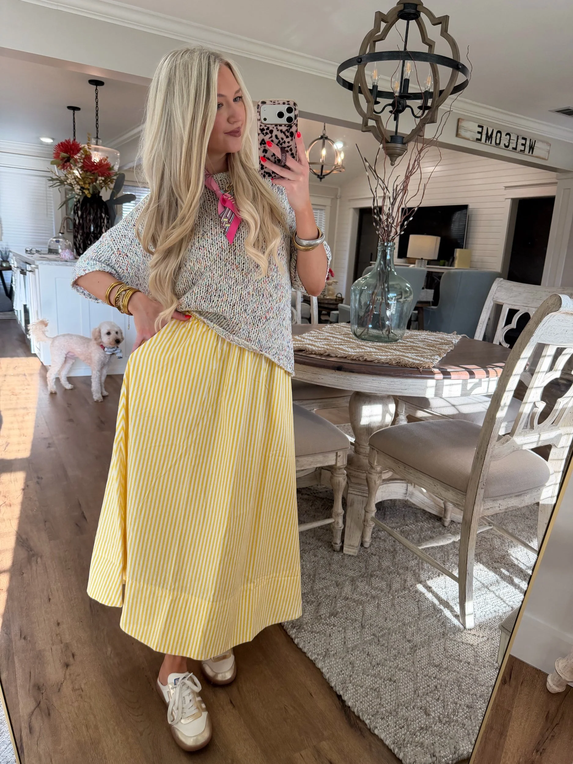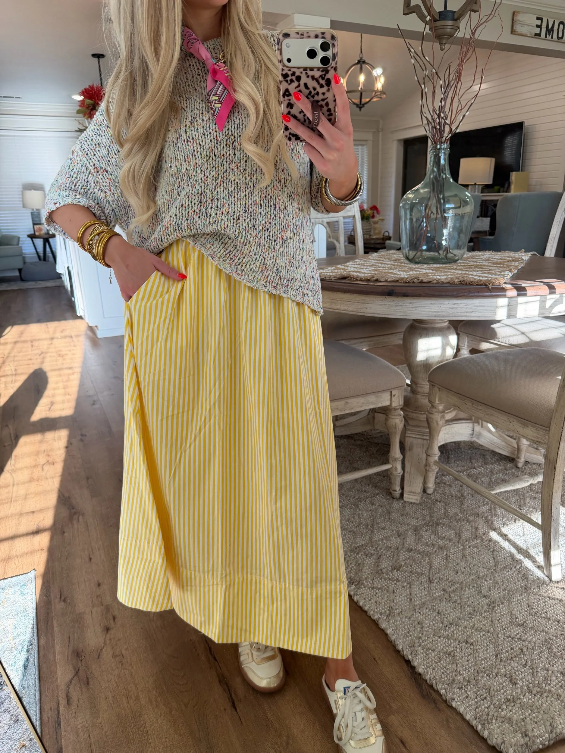 Shop › Striped Midi Skirt - Yellow Image 1 of 4 Image 2 of 4 Image 3 of 4 Image 4 of 4 Striped Midi Skirt - Yellow $34.00 • Elastic waistband• True to size• Paired with our Rainbow Sweater• Macie is 5’2 wearing the small Size: Small Medium Large Get notified by email when this product is in stock. Add To Cart Added! • Elastic waistband• True to size• Paired with our Rainbow Sweater• Macie is 5’2 wearing the small